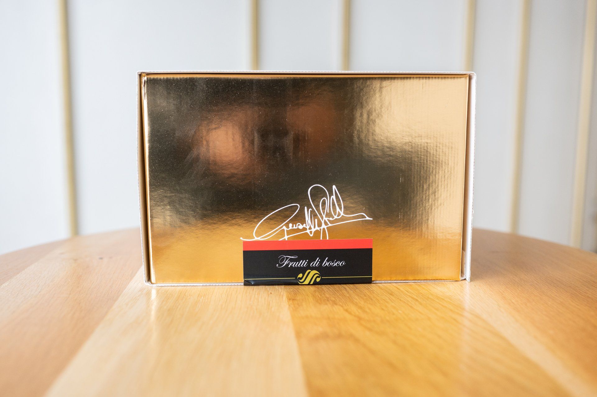 Il panettone si presenta ricoperto di una gustosa glassa di cioccolato bianco e noci, all’interno del quale si possono gustare morbidi pezzi di albicocche e amarene.